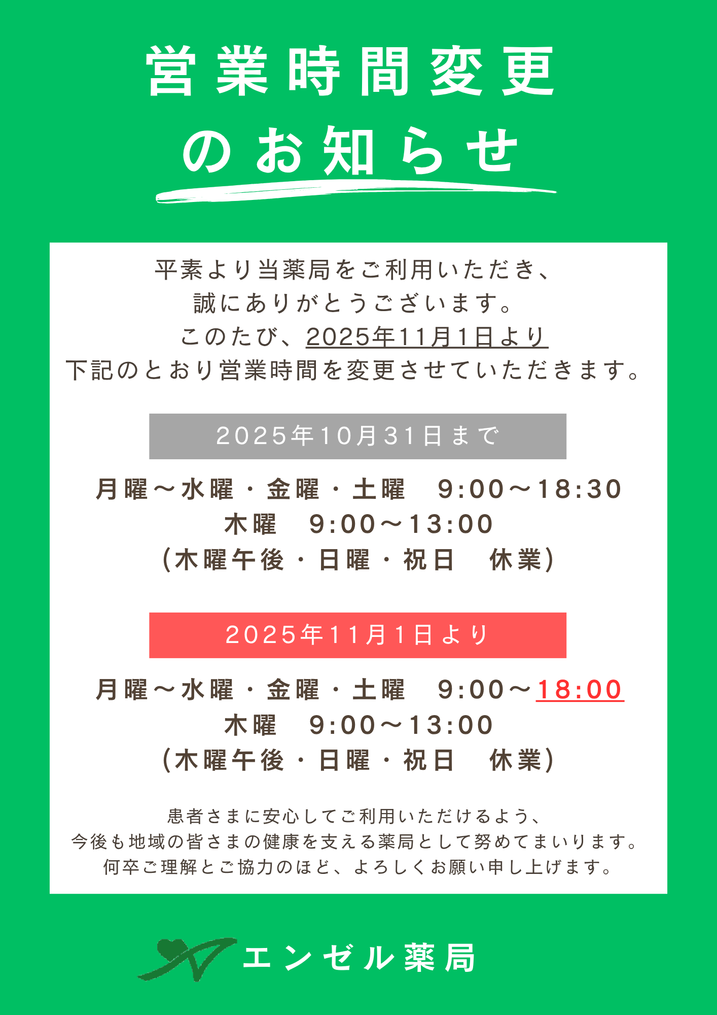 ~11/1より営業時間 変更のお知らせ【竹原店】~